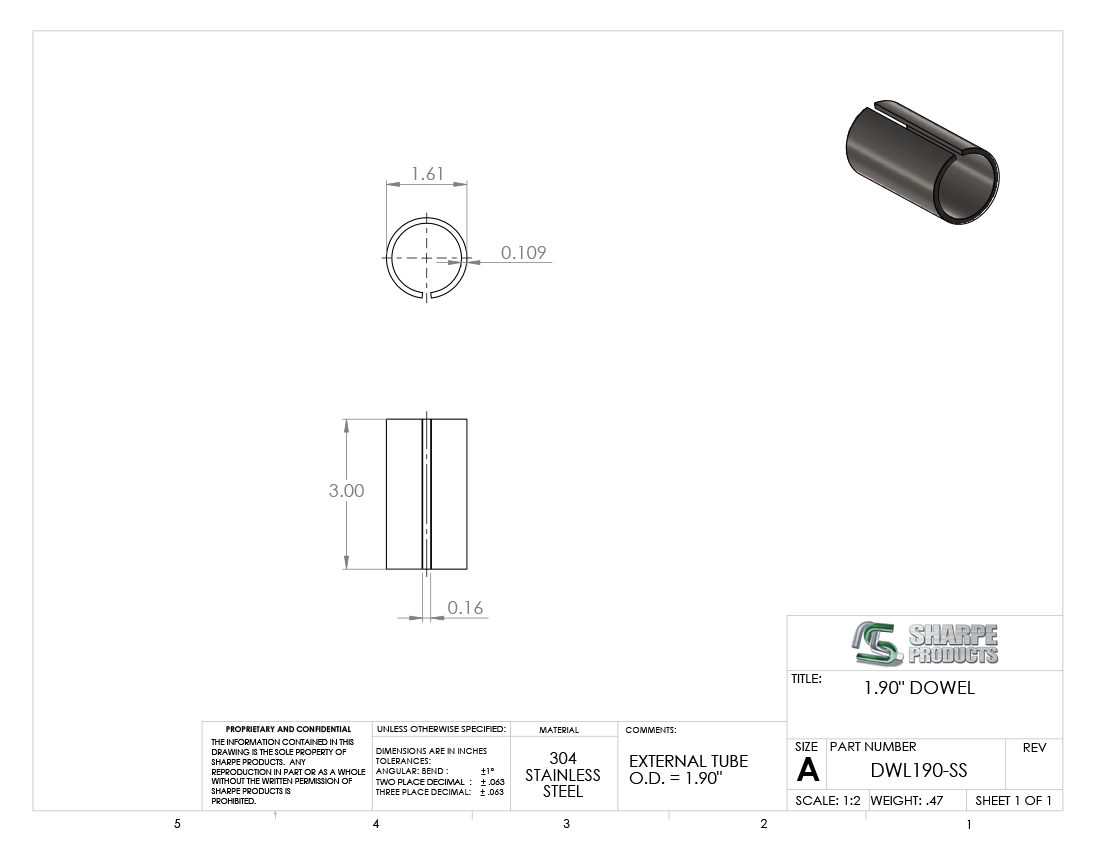 DOWEL S/S 304 FOR 1 1/2 SCH 40 (1.90 O.D. X .145 WALL), SPLICE