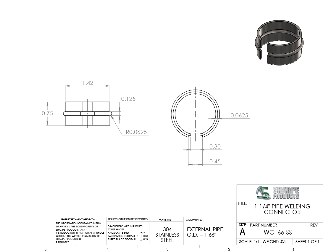 WELD CONNECTOR, 1 1/4 SCH 40 PIPE (1.66 O.D. X .140 WALL) OR 1 1/2 O.D. X .065 WALL (16 GAGE), S/S 304