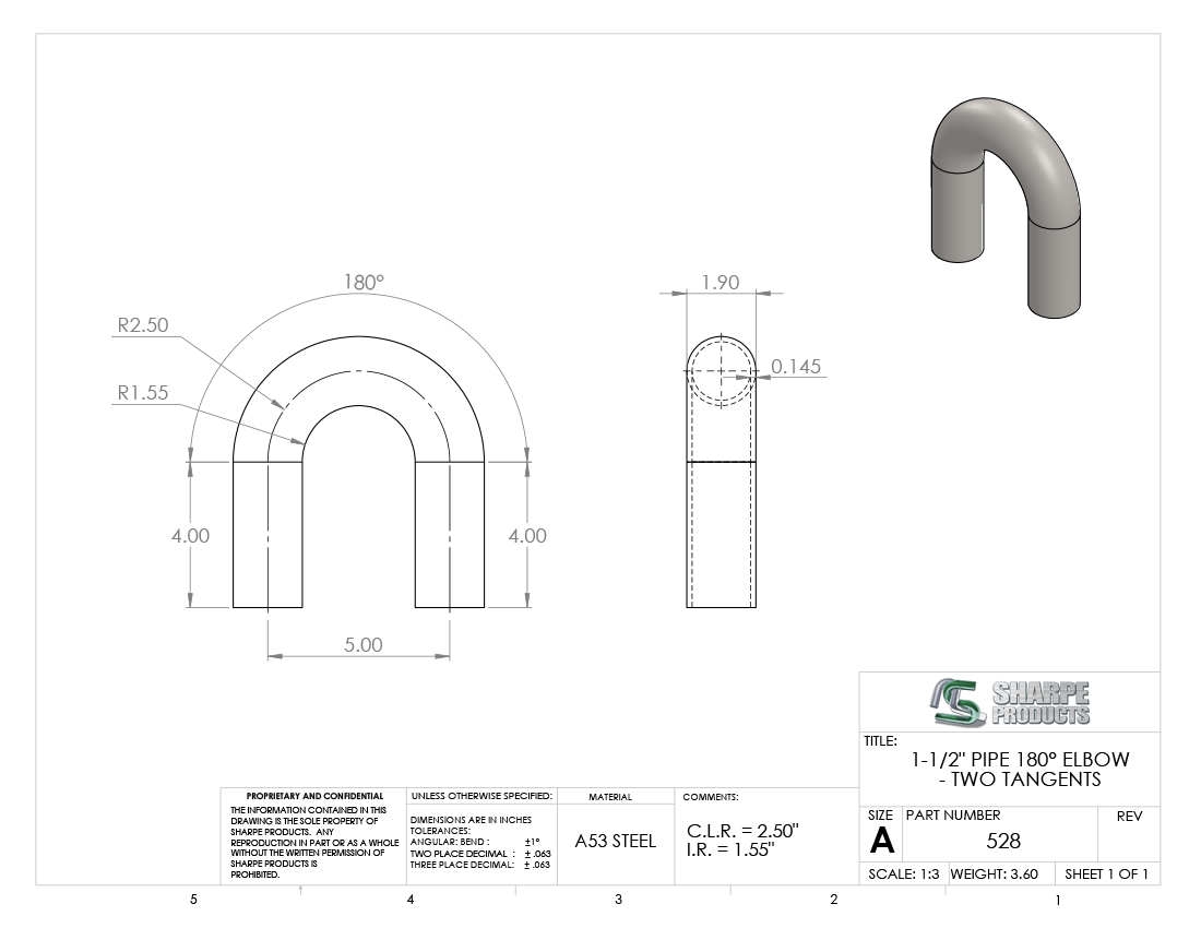 #528 - STEEL 1 1/2" PIPE 180° ELBOW W/ TANGENTS 2.5" C.L.R.