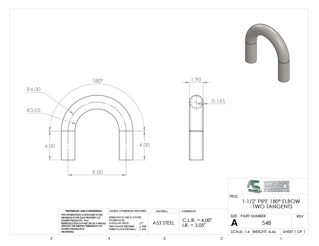 #548 - STEEL 1 1/2" PIPE 180° ELBOW W/ TANGENTS 4" C.L.R.