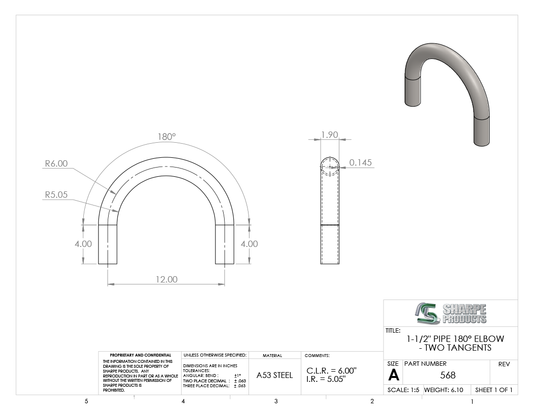 1 1/2 SCH 40 (1.90 O.D.) 180° ELL 6 C.L.R. W/ (2) 4 TANS., STEEL