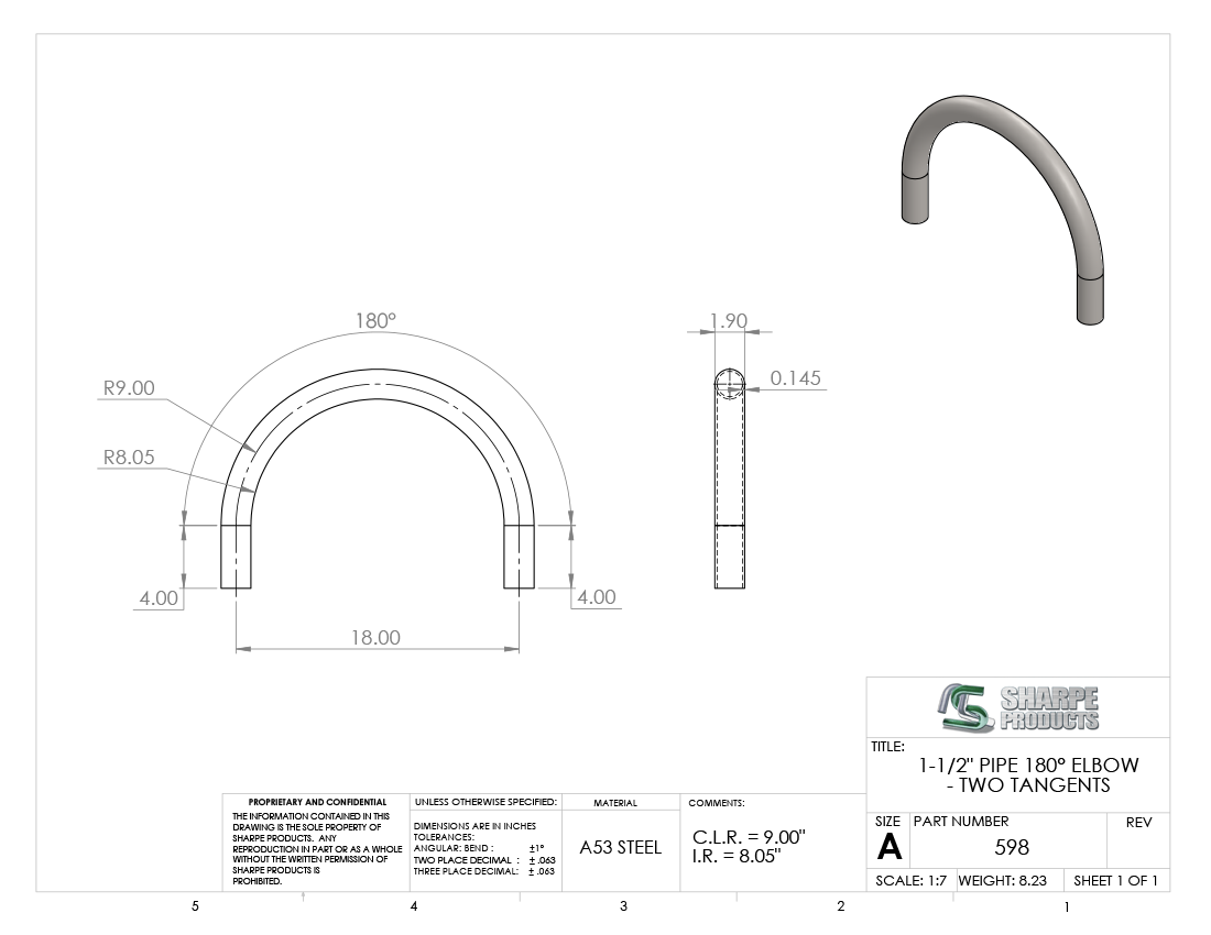 1 1/2 SCH 40 (1.90 O.D.) 180° ELL 9 C.L.R. (± .25) W/ (2) 4 TANS., STEEL