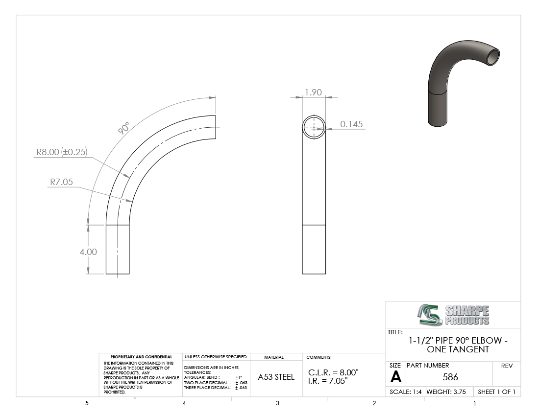 #586 - STEEL 1-1/2" PIPE 90° ELBOW W/1 TANGENT 8" C.L.R.