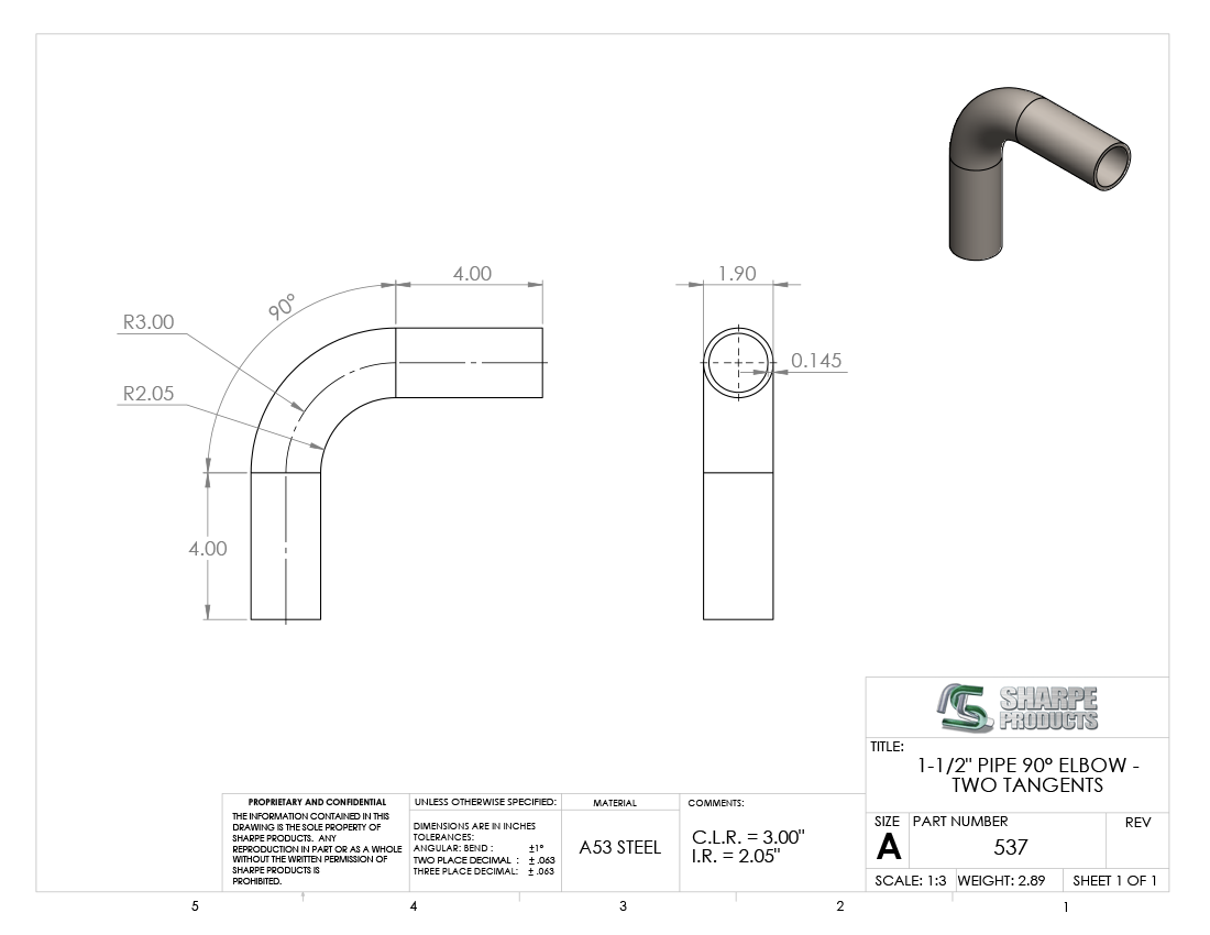 #537 - STEEL 1 1/2" PIPE 90° ELBOW W/ 2 TANGENTS 3" C.L.R.