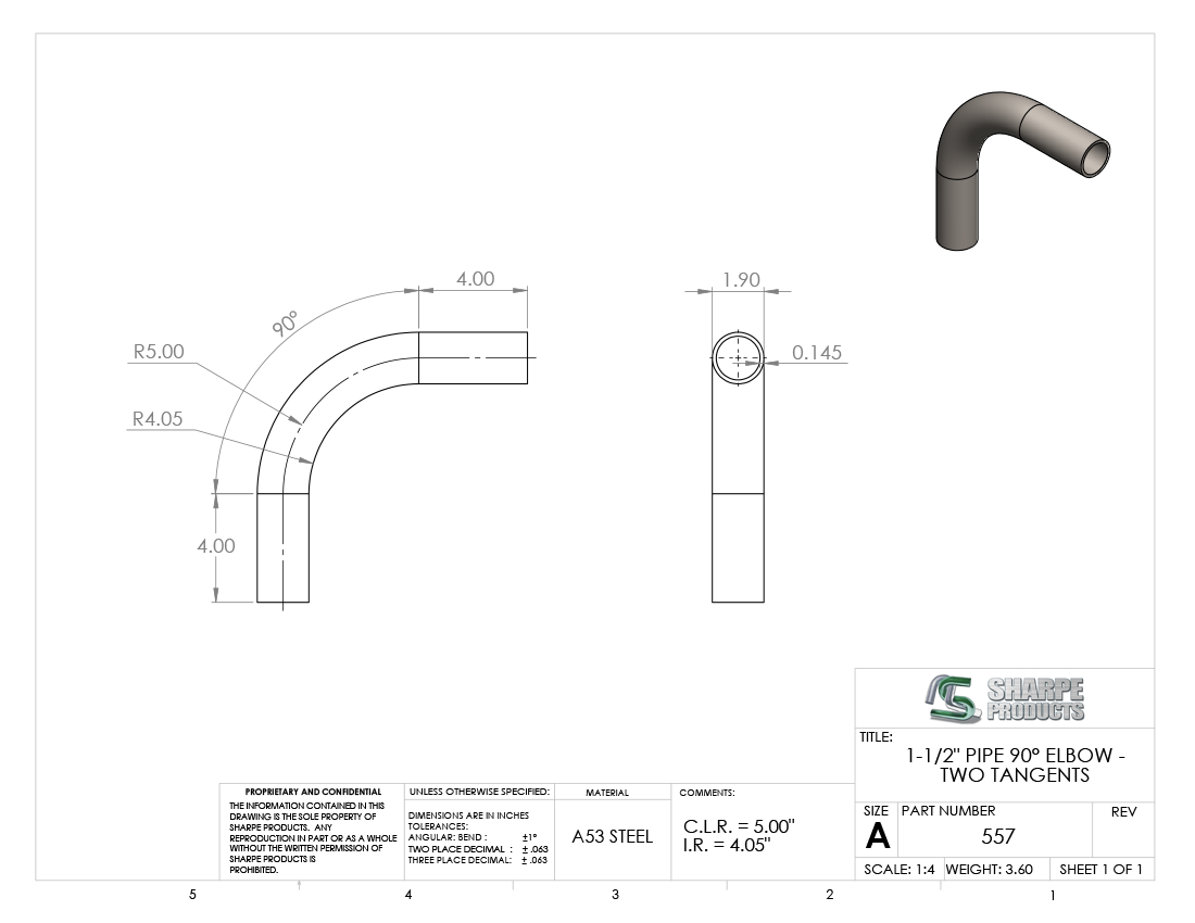 1 1/2 SCH 40 (1.90 O.D.) 90° ELL 5 C.L.R. W/ (2) 4 TANS., STEEL