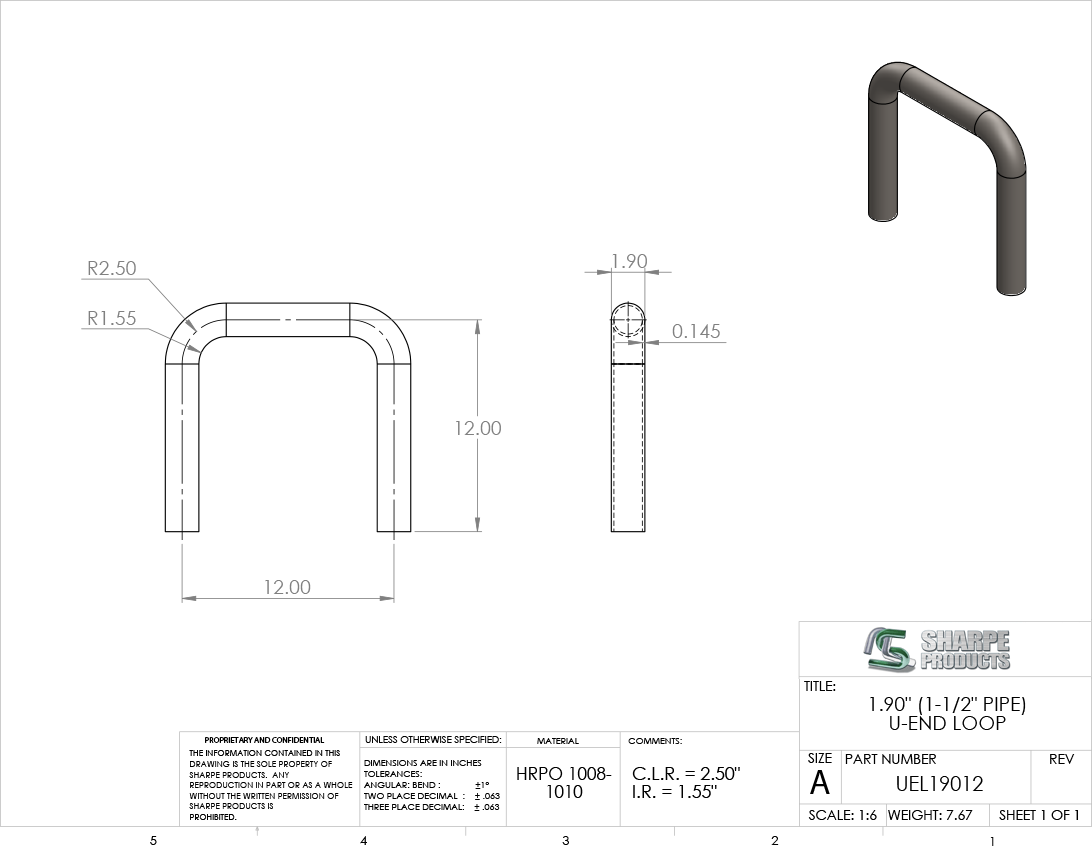 U-END LOOP, 1 1/2 SCH 40 (1.90 O.D.) BENT 90° ON A 2 1/2 C.L.R. (2) PLCS., 12 C-C W/ (2) 12 C-E LEGS, STEEL