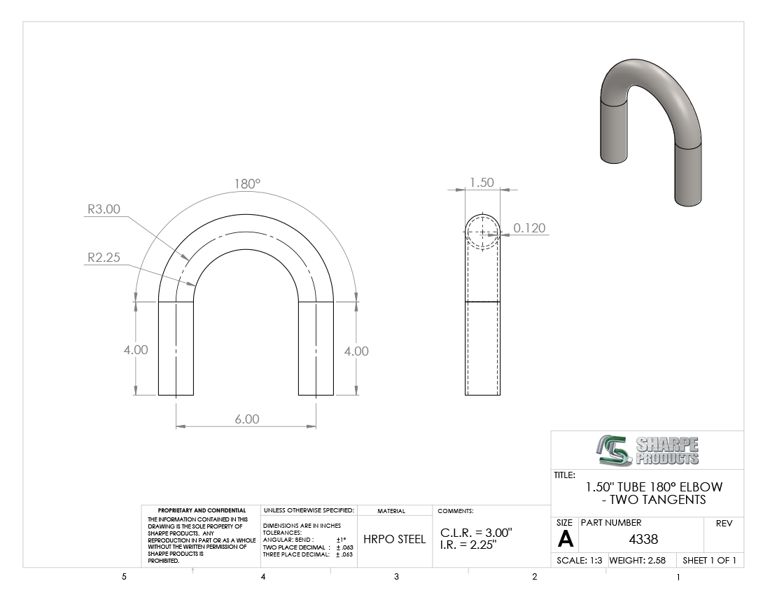 #4338 - STEEL 1 1/2" TUBE 180° ELBOW W/ TANGENTS 3" C.L.R.