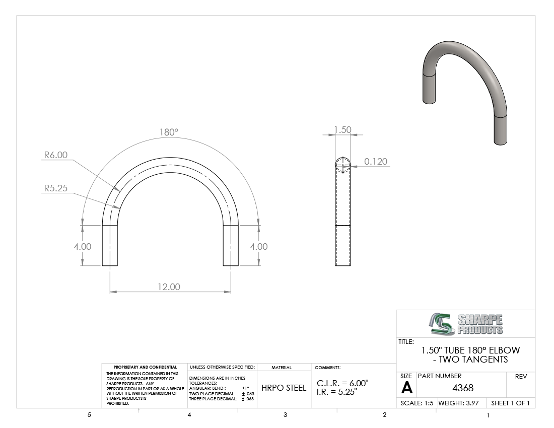#4368 - STEEL 1 1/2" TUBE 180° ELBOW W/ TANGENTS 6" C.L.R.