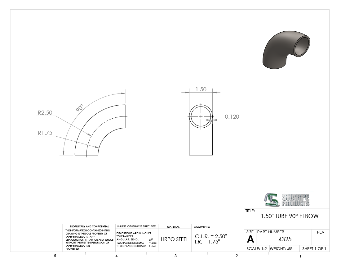 #4325 - STEEL 1-1/2" TUBE 90° ELBOW 2.5" C.L.R.