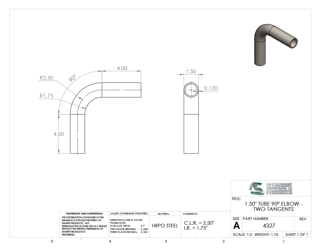 #4327 - STEEL 1 1/2" TUBE 90° ELBOW W/ 2 TANGENTS 2.5" C.L.R.
