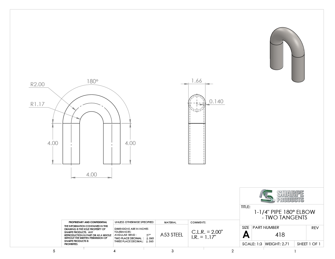 1 1/4 SCH 40 (1.66 O.D.) 180° ELL 2 C.L.R. W/ (2) 4 TANS., STEEL