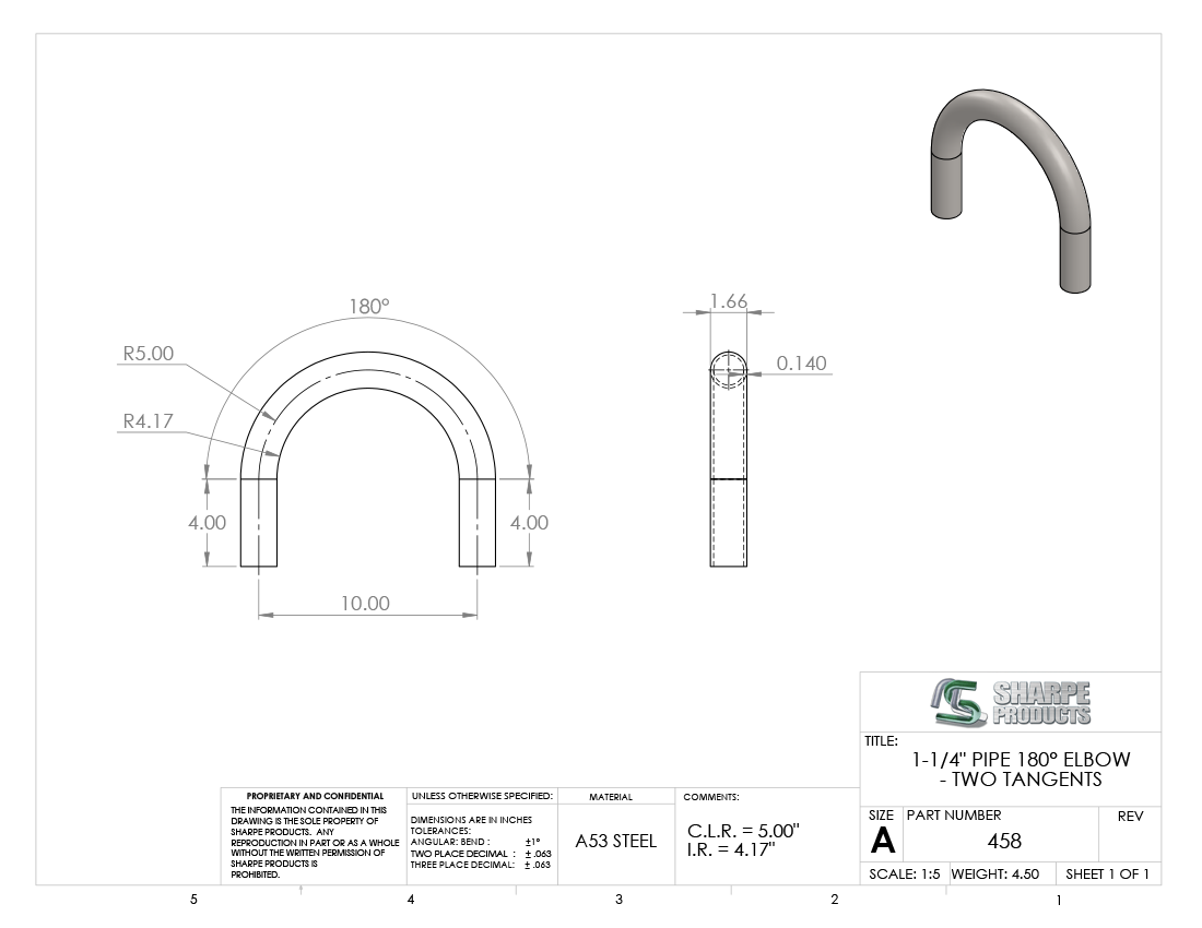 1 1/4 SCH 40 (1.66 O.D.) 180° ELL 5 C.L.R. W/ (2) 4 TANS., STEEL