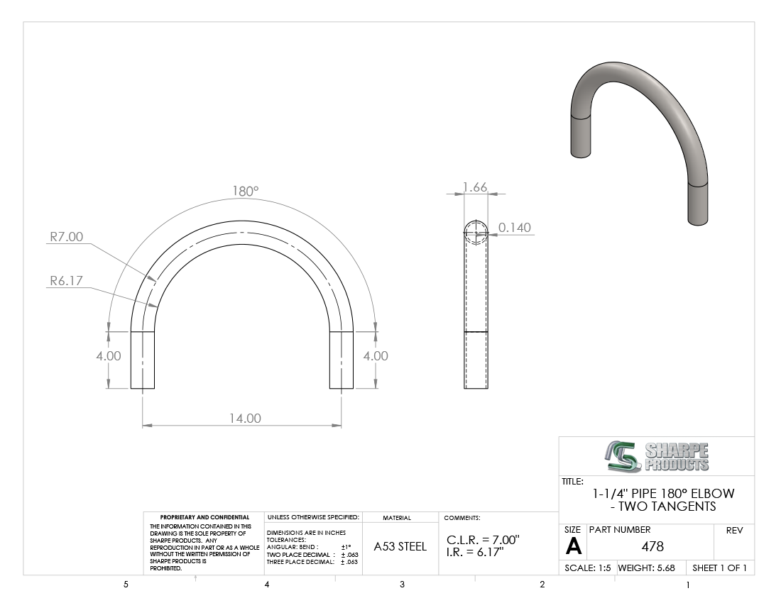 1 1/4 SCH 40 (1.66 O.D.) 180° ELL 7 C.L.R. W/ (2) 4 TANS., STEEL