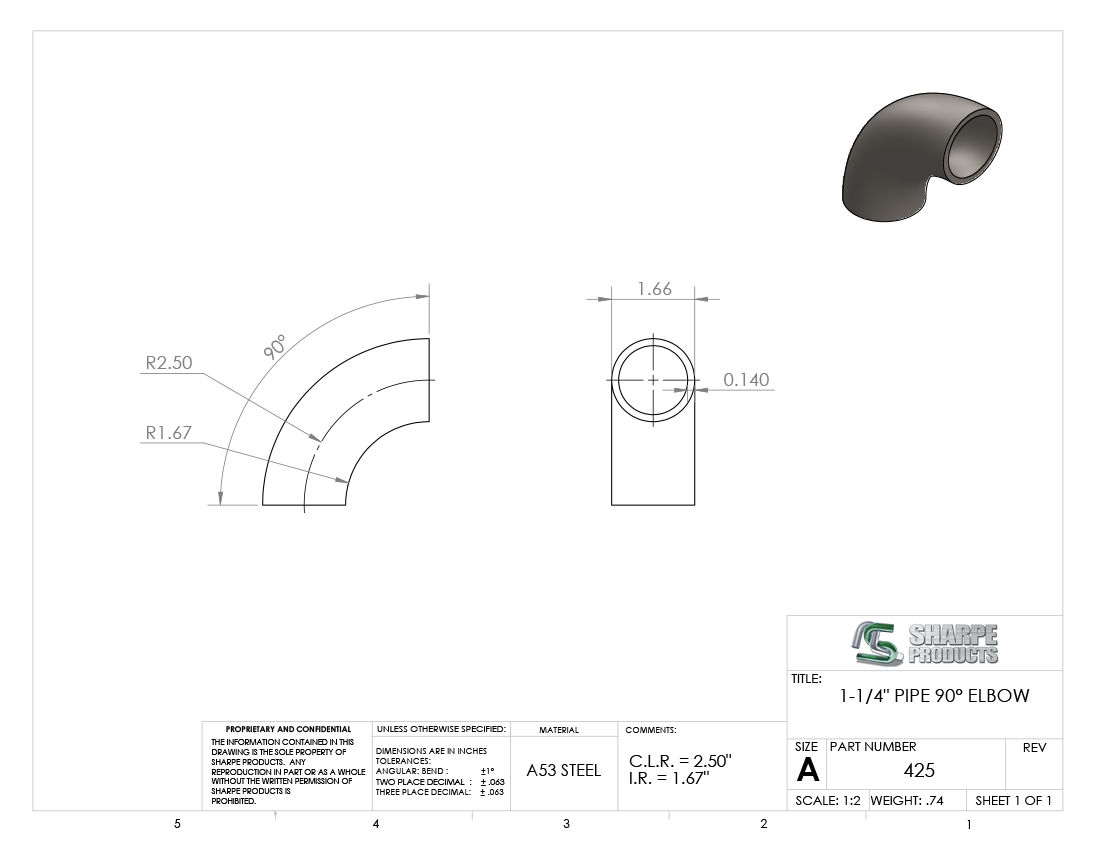 #425 - STEEL 1 1/4" PIPE 90° ELBOW 2.5" C.L.R.