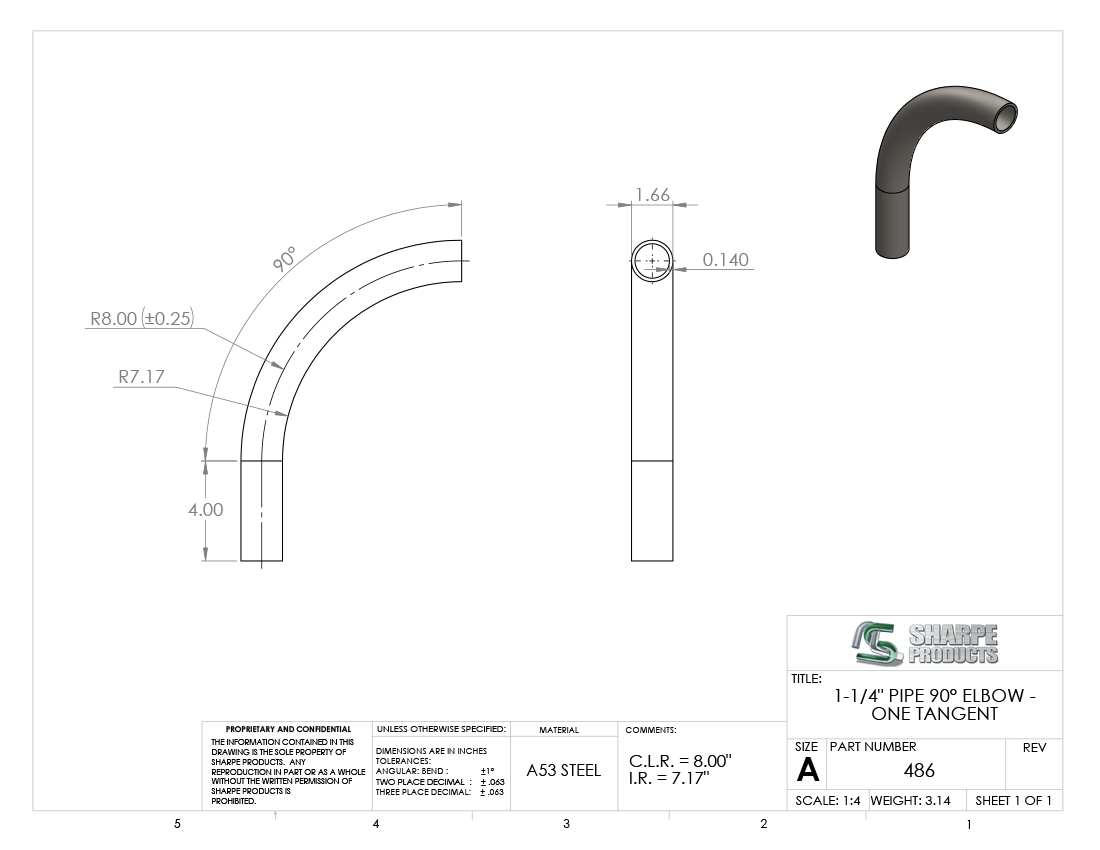 #486 - STEEL 1 1/4" PIPE 90° ELBOW W/ 1 TANGENT 8" C.L.R.