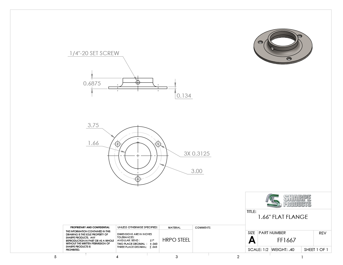FLAT FLANGE, 1 1/4 PIPE (1.66 OD) W/ (3) HOLES & SET SCREW STEEL