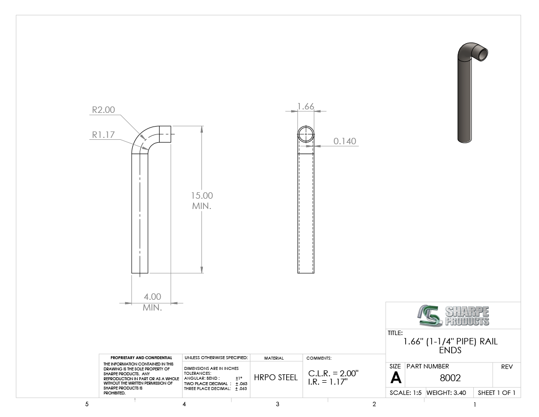 1 1/4 SCH 40 (1.66 O.D.) 90° ELL 2 C.L.R. W/ (1) MIN.& (1) 12.17 TAN., STEEL