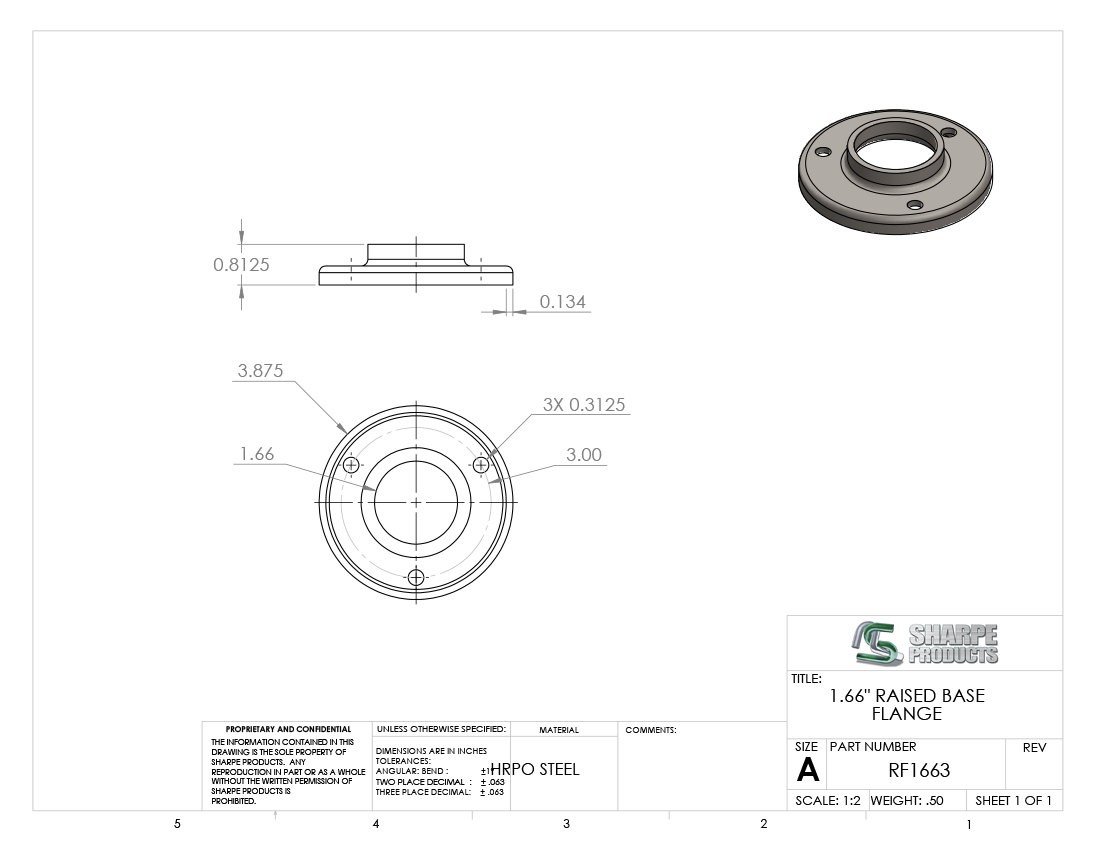RAISED FLANGE, 1 1/4 PIPE (1.66 O.D.) W/ (3) HOLES, STEEL