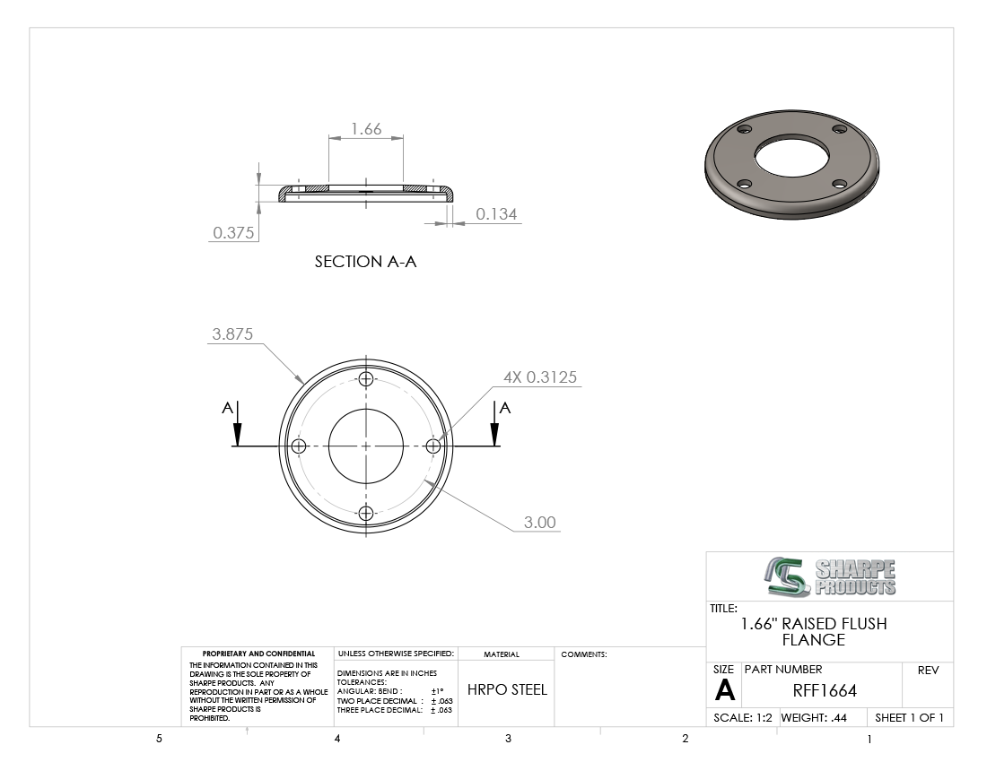 RAISED FLUSH FLANGE, 1 1/4 PIPE (1.66 O.D.) W/(4) HOLES, STEEL