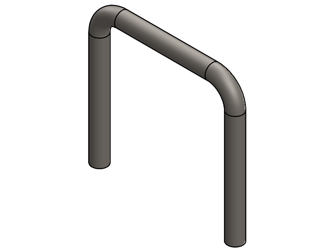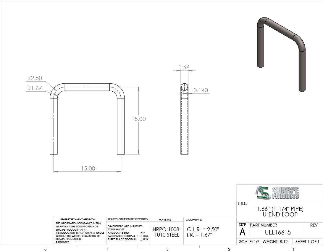 U-END LOOP, 1 1/4 SCH 40 (1.66 O.D.) BENT 90° ON A 2 1/2 C.L.R. (2) PLCS., 15 C-C W/ (2) 15 C-E LEGS, STEEL TOLERANCES: ±.063