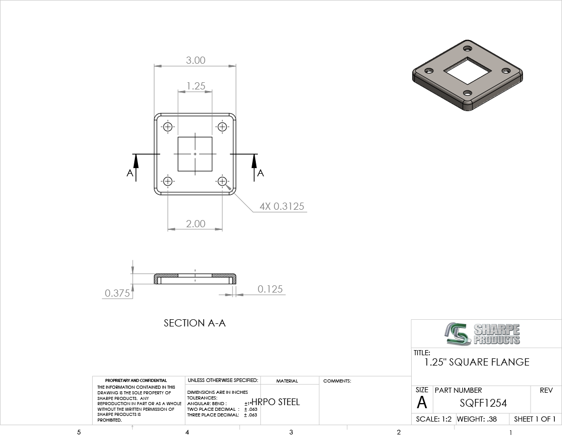 SQ. FLUSH FLANGE, 1 1/4 W/ (4) HOLES, STEEL