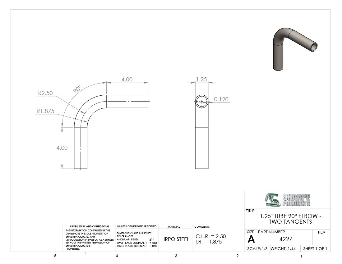 #4227 - STEEL 1 1/4" TUBE 90° ELBOW W/ 2 TANGENTS 2.5" C.L.R.