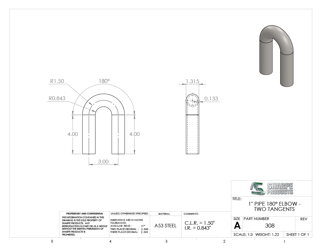 #308 - STEEL 1" PIPE 180° ELBOW W/TANGENTS 1.5" C.L.R.