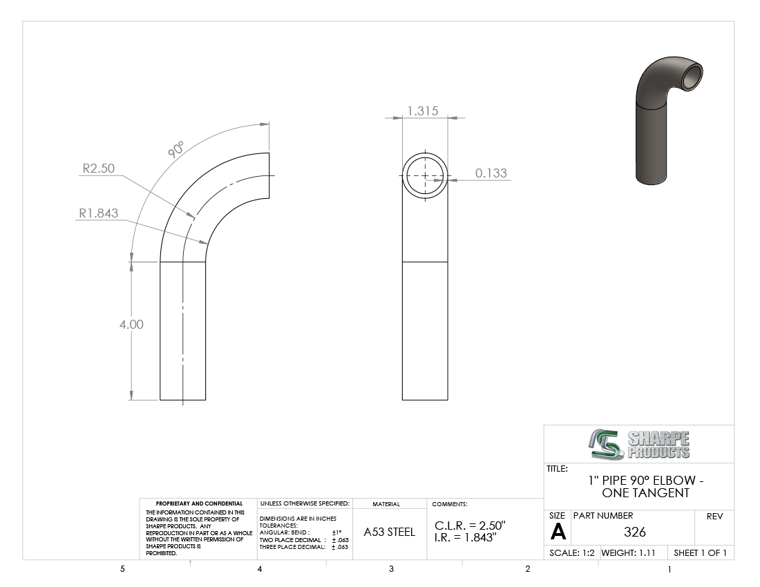 #326 - STEEL 1" PIPE 90° ELBOW W/ 1 TANGENT 2.5" C.L.R.