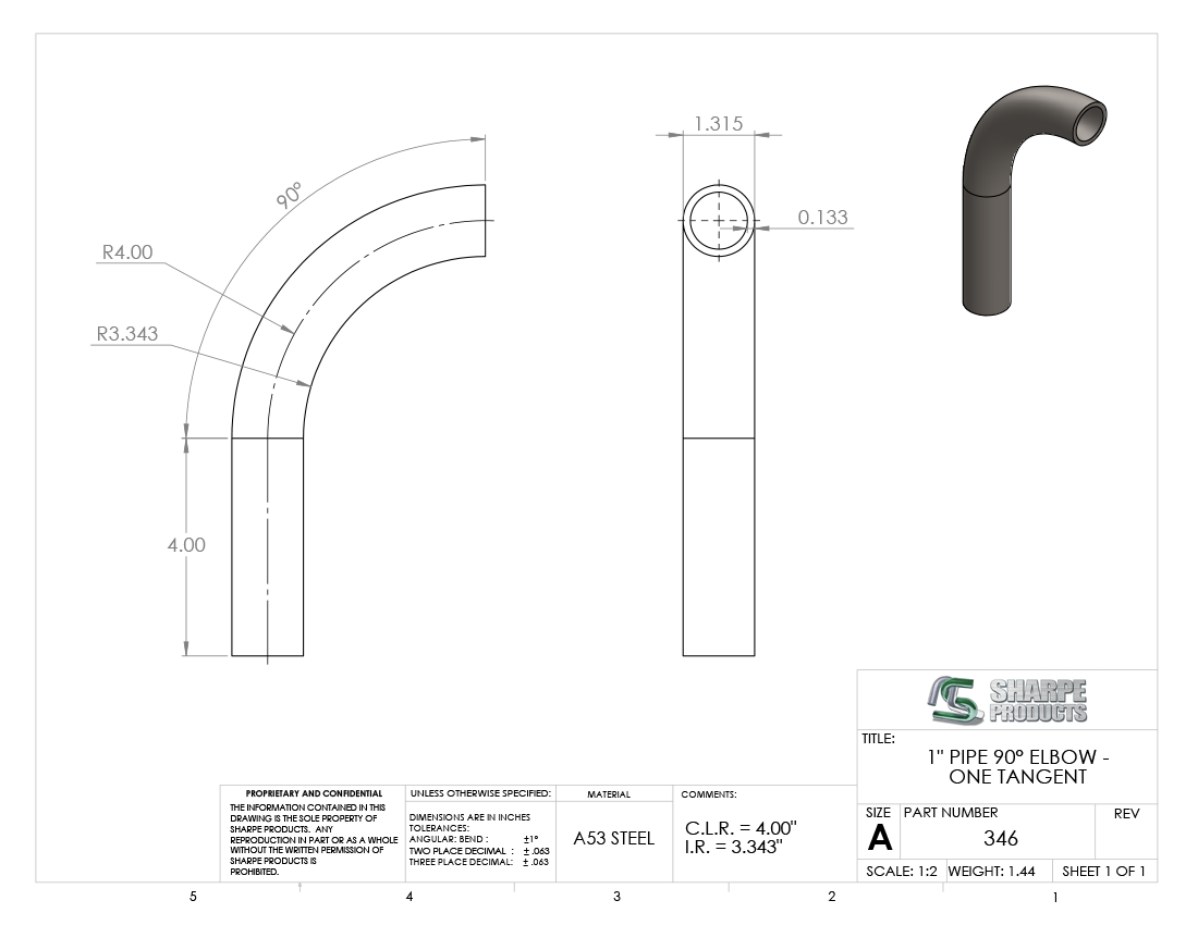 #346 - STEEL 1" PIPE 90° ELBOW W/ 1 TANGENT 4" C.L.R.