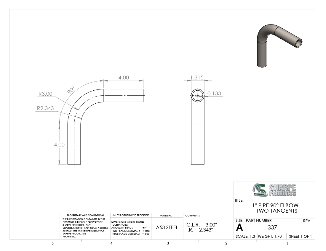 #337 - STEEL 1" PIPE 90° ELBOW W/2 TANGENTS 3" C.L.R.
