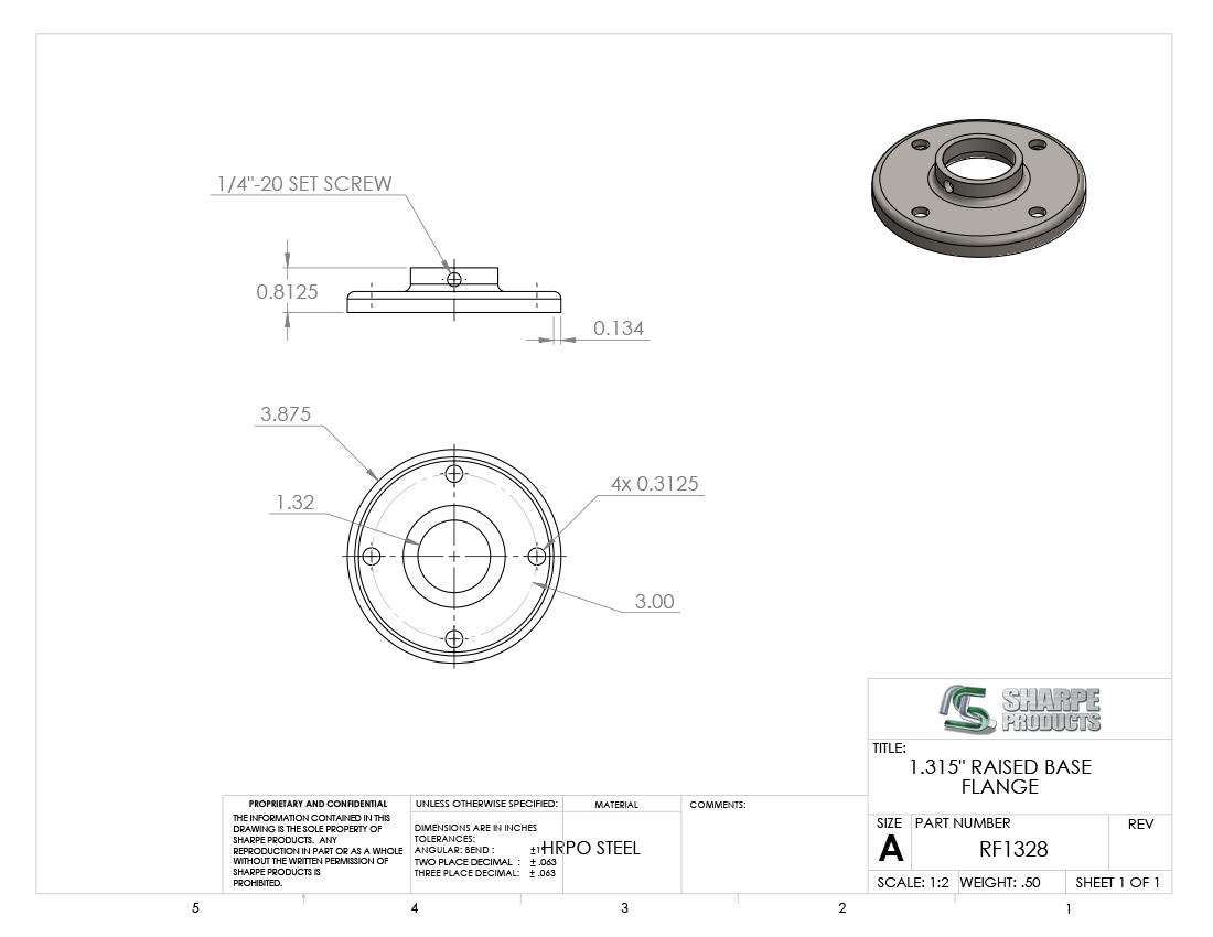 RAISED FLANGE, 1 PIPE (1.315 OD) W/ (4) HOLES & SET SCREW, STEEL