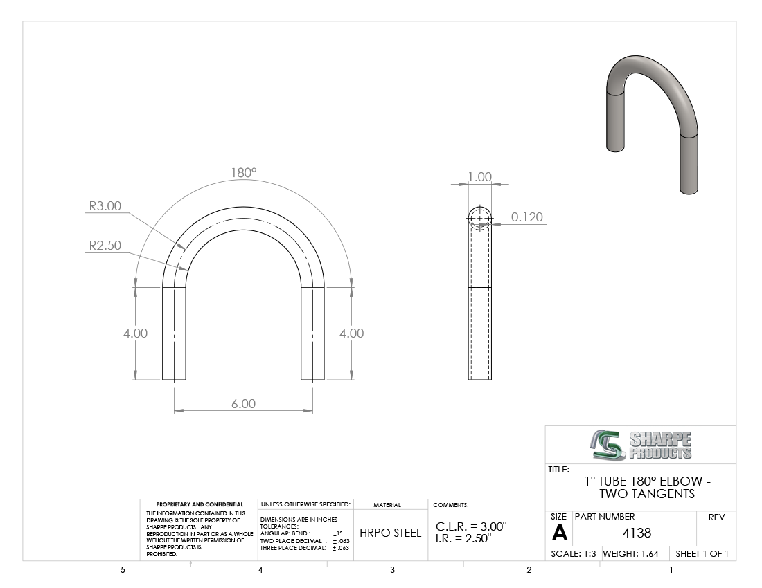 #4138 - STEEL 1" TUBE 180° ELBOW W/ TANGENTS 3" C.L.R.