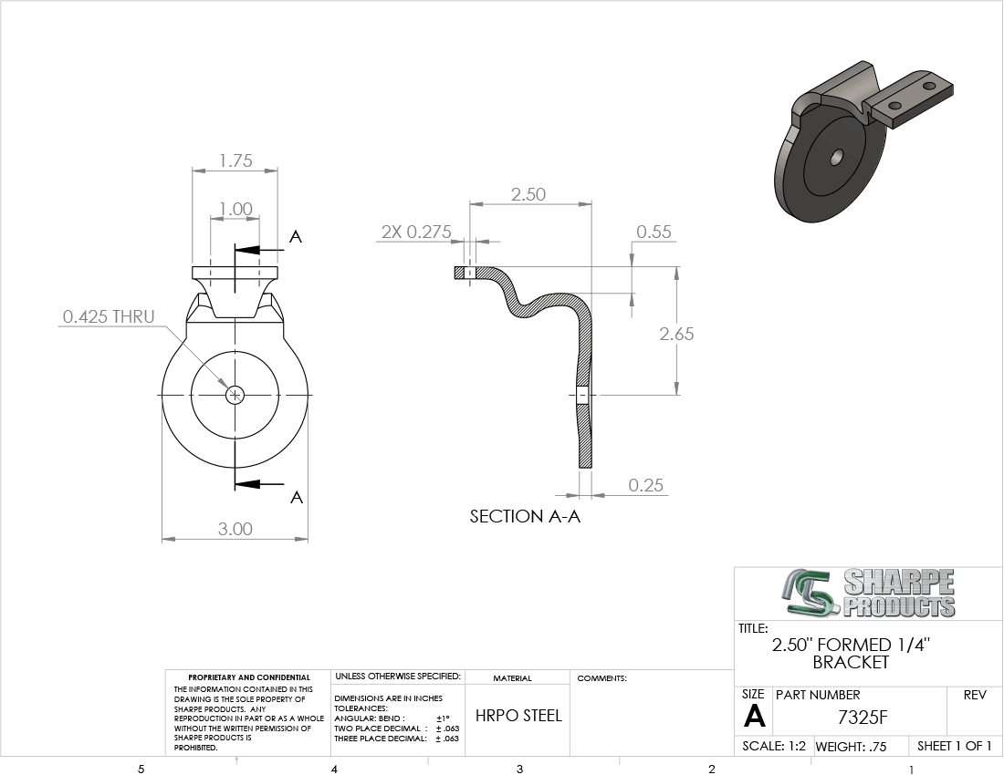 #7325F - STEEL 1/4" FORMED BRACKET, 2-1/2" C.L., FLAT SADDLE