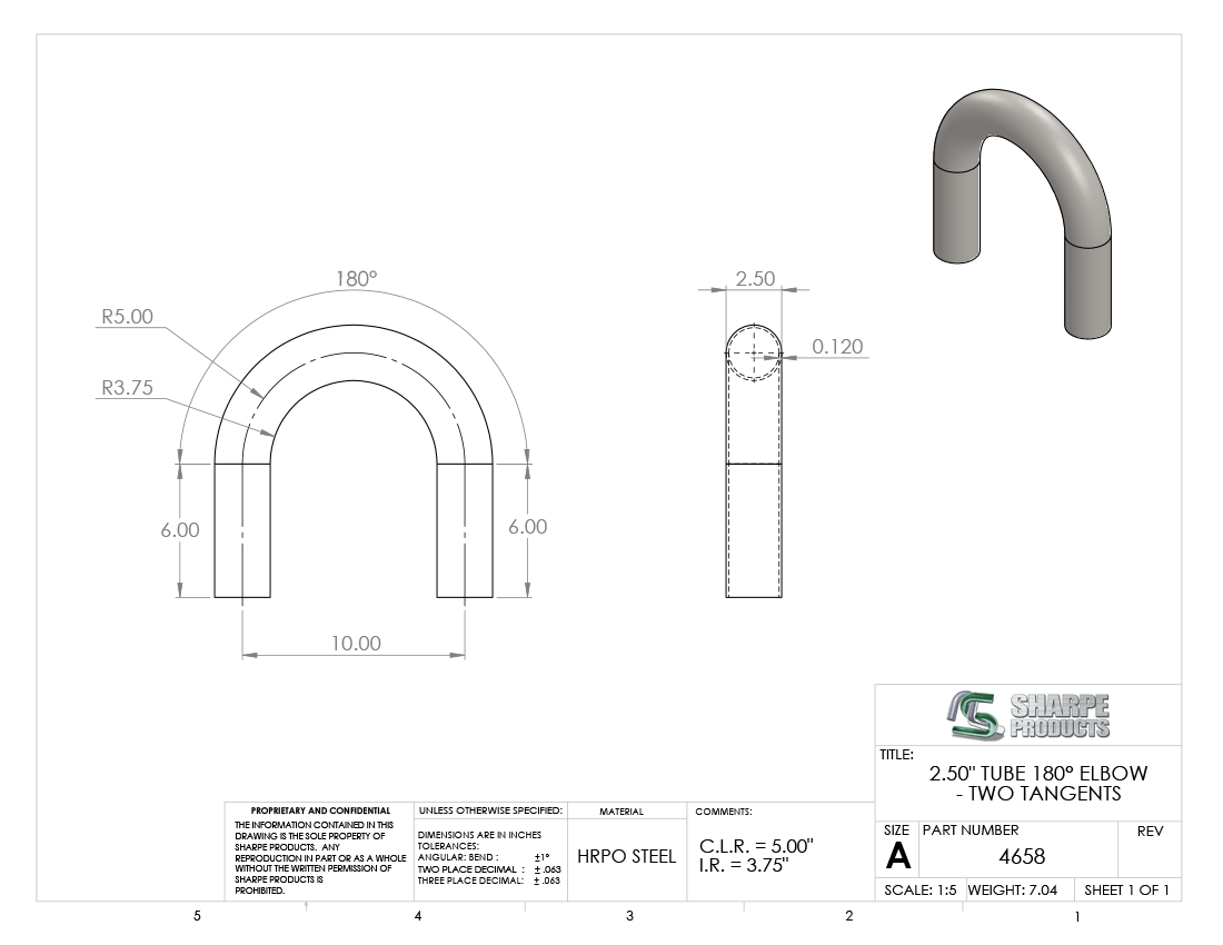 2 1/2 O.D. X .120 WALL (11 GAGE) 180° ELL 5 C.L.R. W/ (2) 6 TANS., STEEL