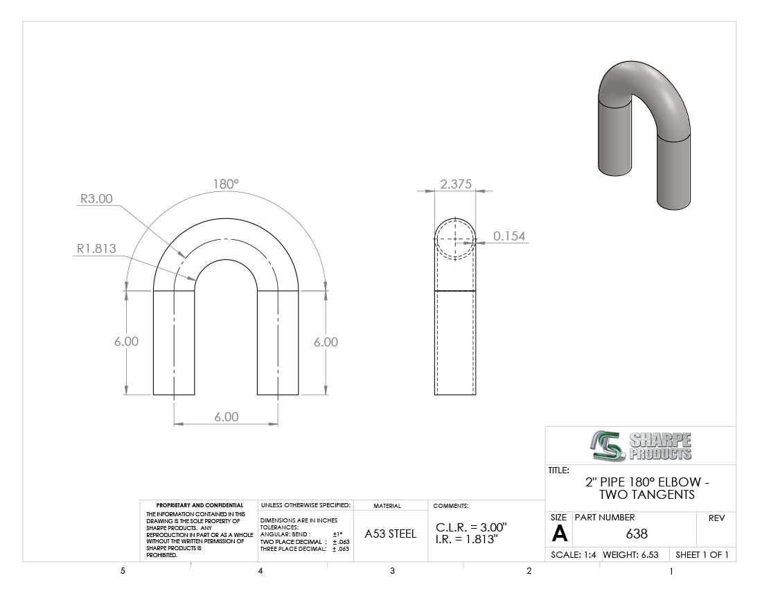 #638 - STEEL 2" PIPE 180° ELBOW W/ TANGENTS 3" C.L.R.