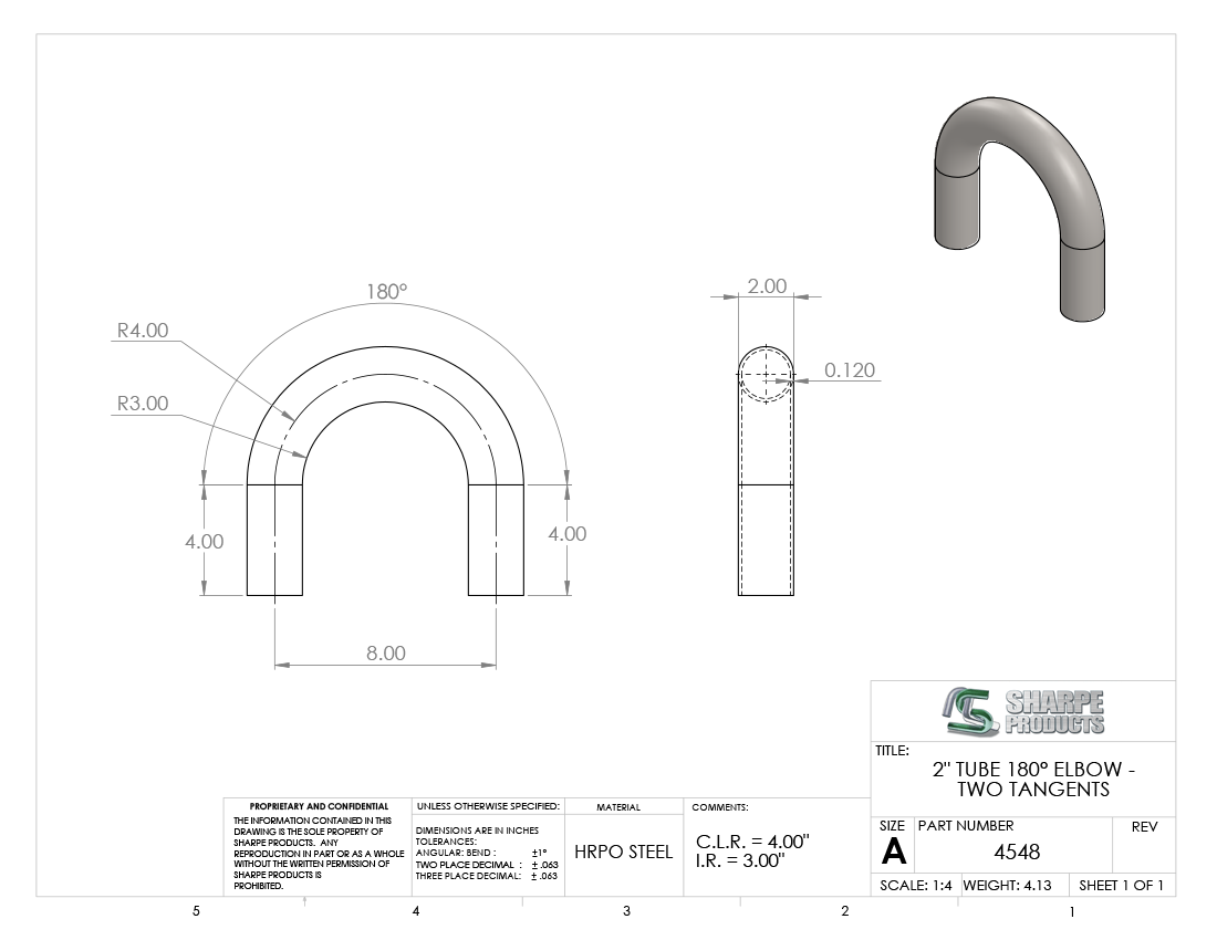 2 O.D. X .120 WALL (11 GAGE) 180° ELL 4 C.L.R. W/ (2) 4 TANS., STEEL