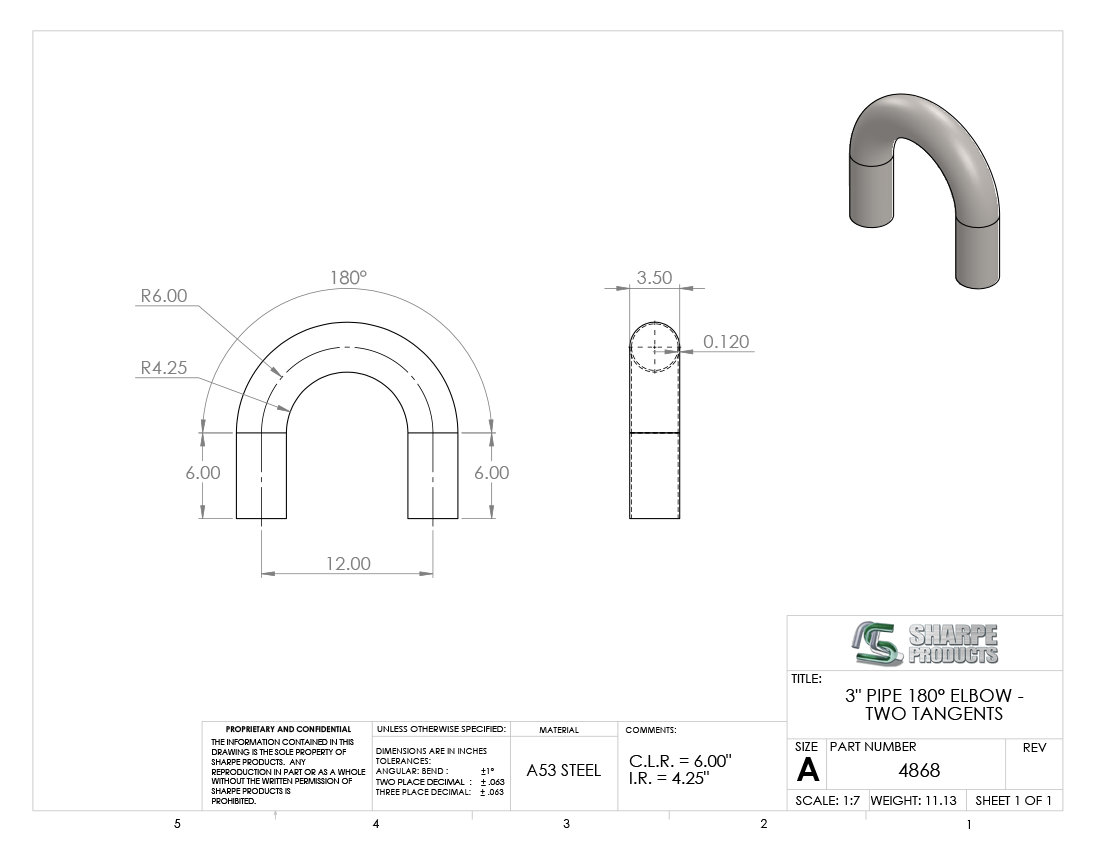 3 1/2 O.D. X .120 WALL (11 GAGE) 180° ELL 6 C.L.R. W/ (2) 6 TANS., STEEL