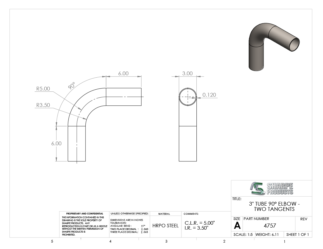 #4757 - STEEL 3" TUBE 90° ELBOW W/ 2 TANGENTS 5" C.L.R.