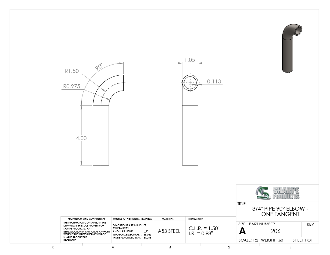 #206 - STEEL 3/4" PIPE 90° ELBOW W/ 1 TANGENT 1.5" C.L.R.