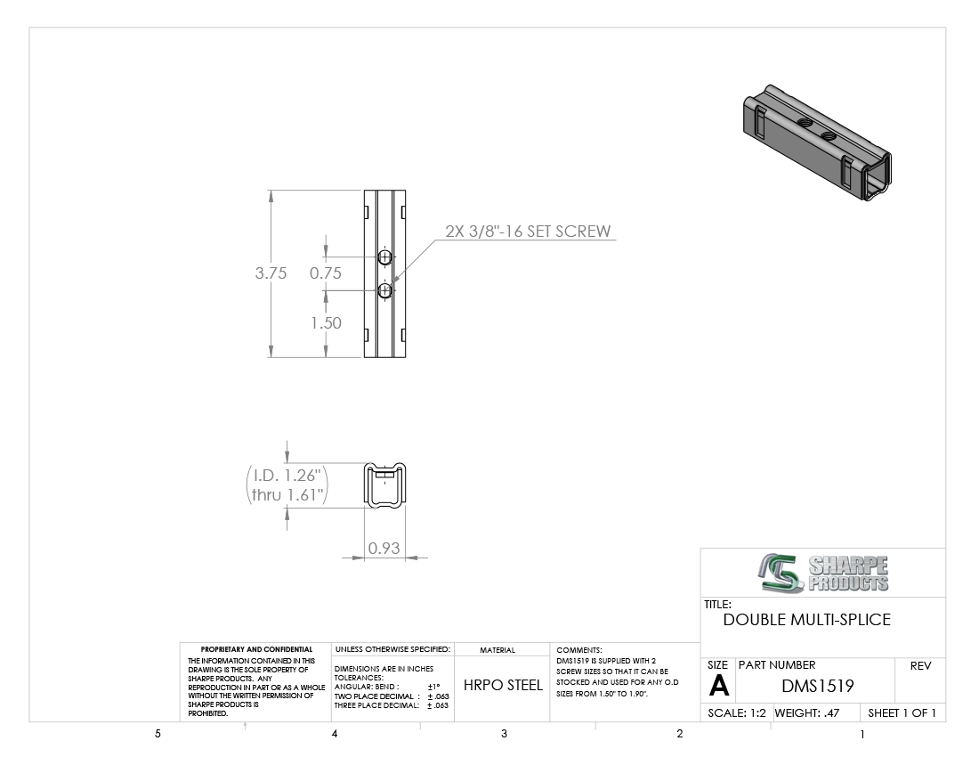 DBL MULTI SPLICE ASSEMBLY, FITS 1 1/2 O.D. (APPROX. 1.25 I.D.) THRU 1 1/2 SCH 40 (APPROX. 1.61 I.D.), STEEL - SUPPLIED W/ (4) 3/8-16 Z.P. SET SCREWS (PICKED ON A SEPARATE LINE) **(2) @ 1 1/4 LONG **(2) @ 1 1/2 LONG