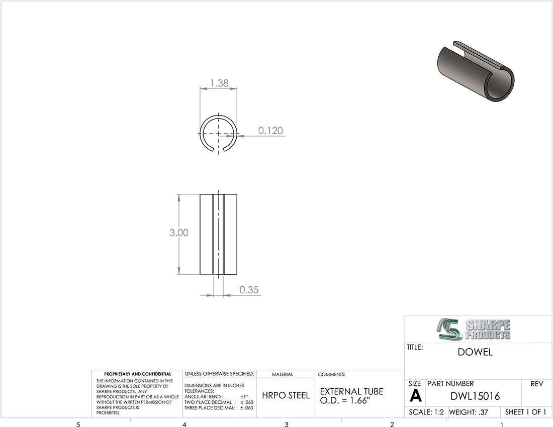 #DWL15016 - STEEL DOWEL, 1 1/2" TUBE 16 Ga.