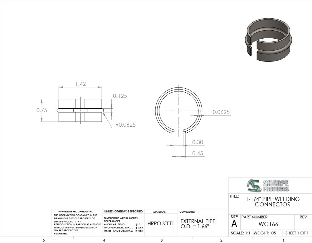 WELD CONNECTOR, 1 1/4 SCH 40 PIPE (1.66 O.D. X .140 WALL) OR 1 1/2 O.D. X .065 WALL (16 GAGE), STEEL
